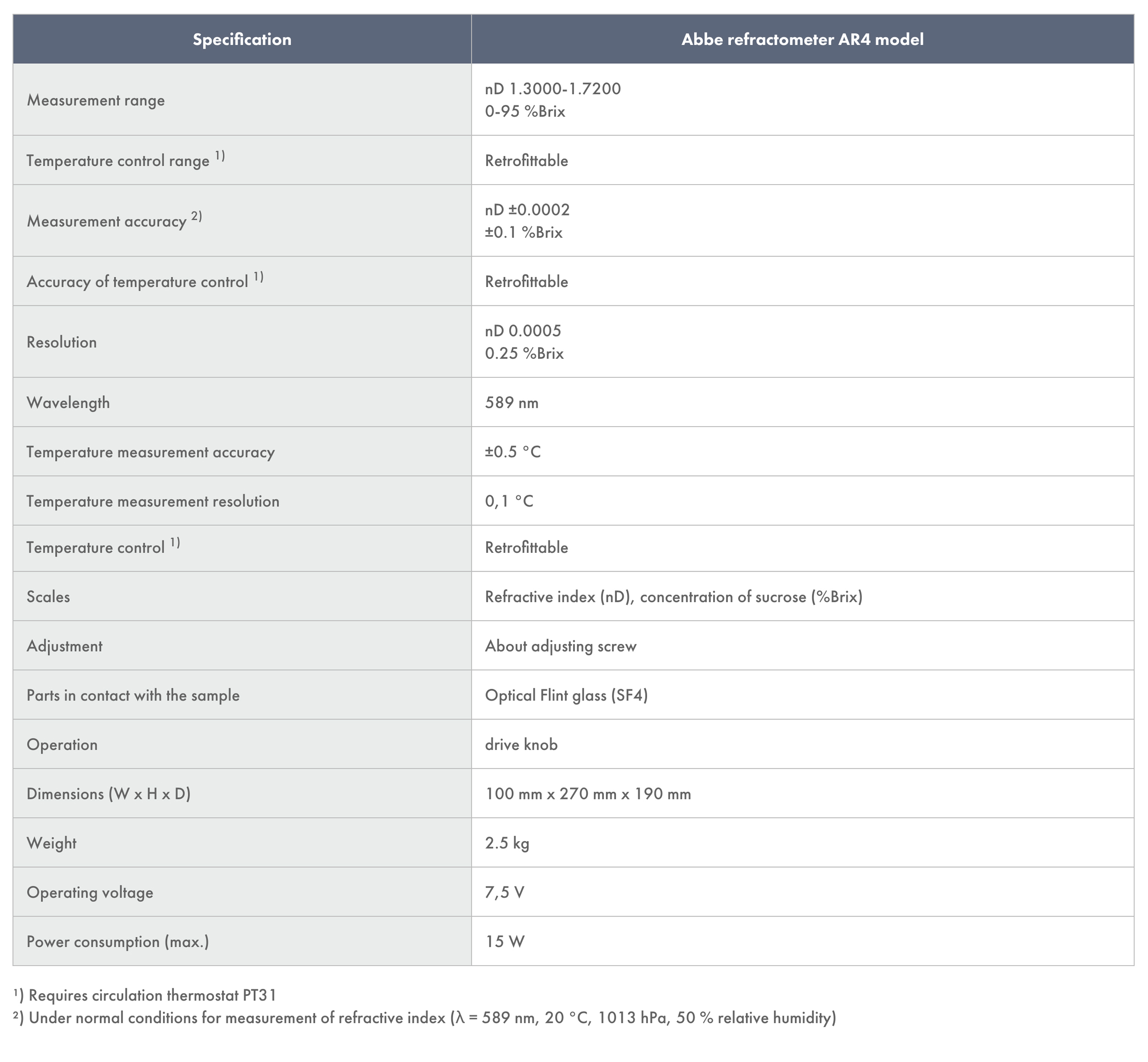 The AR4 Abbe Refractometer is a high-precision optical instrument designed for measuring the refractive index and Brix values of liquid and solid samples. This classic laboratory tool allows users to manually set scales using a drive knob and read values through an eyepiece. Equipped with an integrated digital thermometer, the AR4 displays temperature readings on an LCD screen. For enhanced accuracy, the refractometer can be connected to a PT31 circulation thermostat, ensuring temperature stability during measurements.