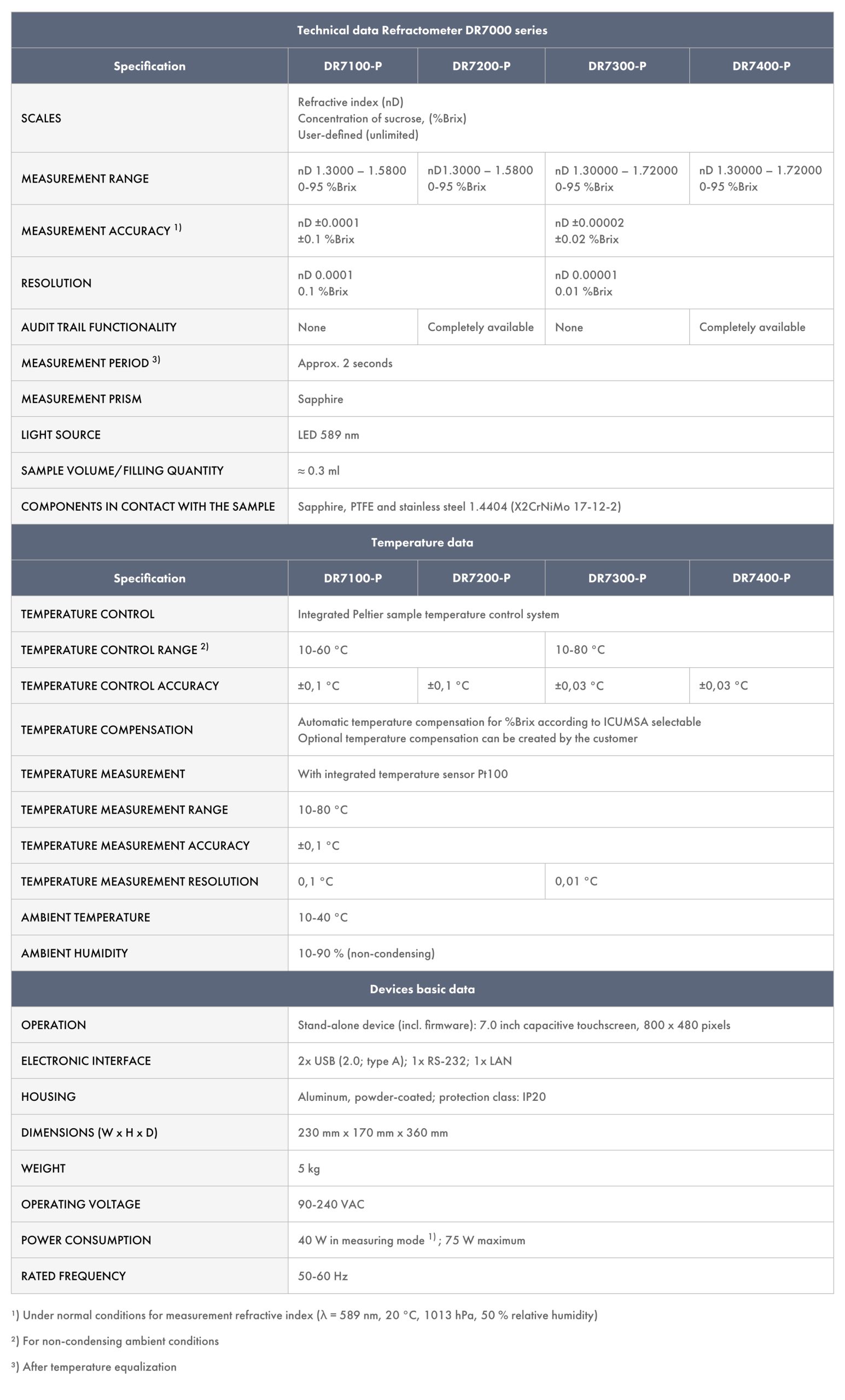 • 21 CFR Part 11 and EU GMP Annex 11 Compliance: The DR7000 refractometers support compliant data storage, with user access controlled by secure login.