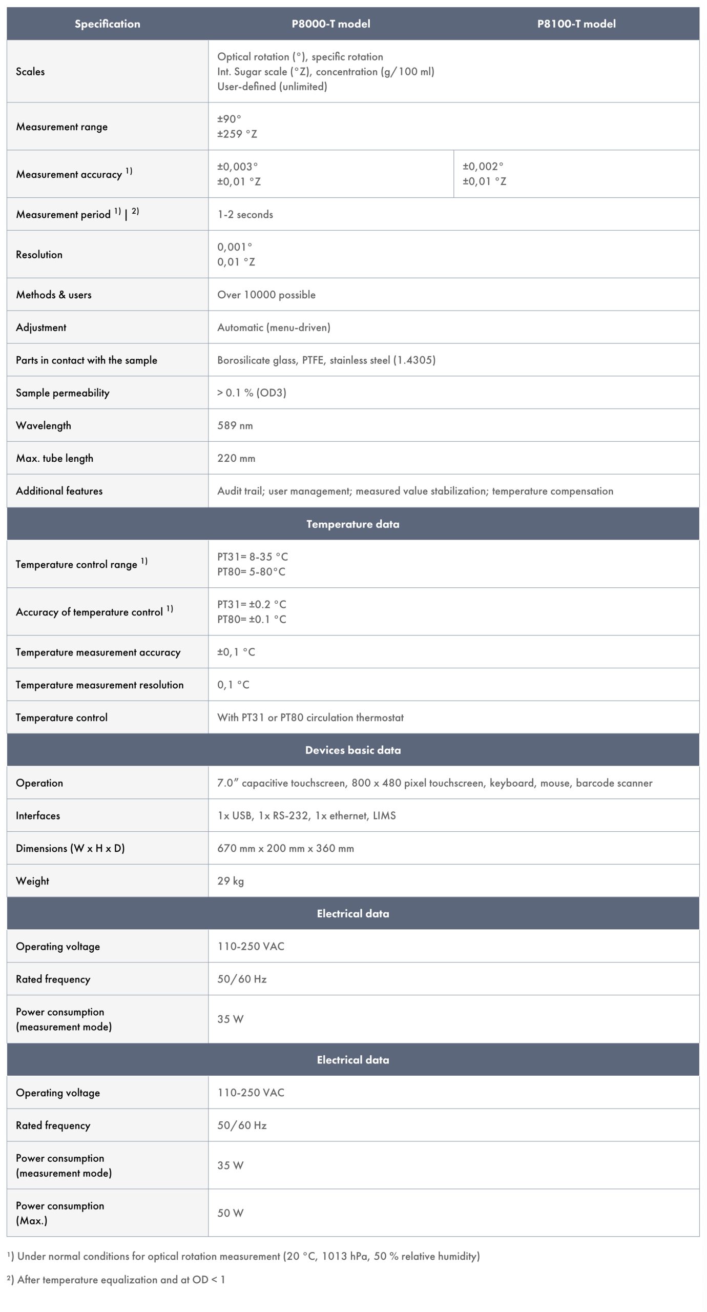 The A.KRÜSS P8000-T and P8100-T Polarimeters offer rapid and precise polarimetric analysis with reliable water-bath temperature control. Their advanced features and compliance with industry standards make them indispensable tools for laboratories demanding high performance and accuracy.