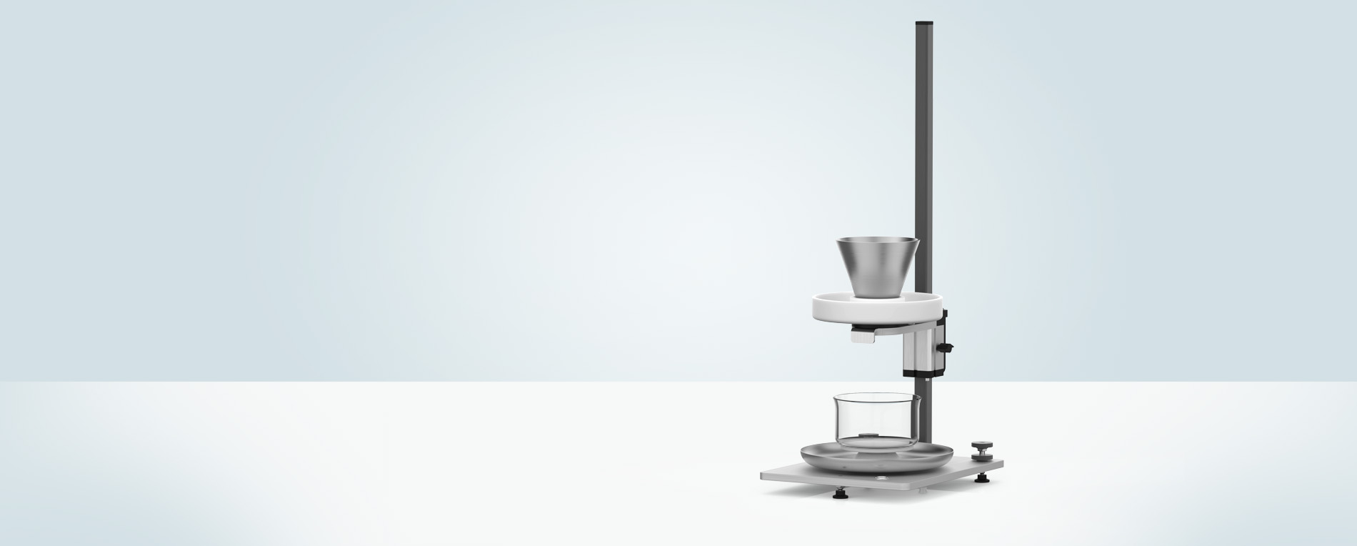 The conical funnel and optional manual stirrer can be adjusted vertically and locked in place without tools, enhancing ease of use with powders of varying flow properties.
